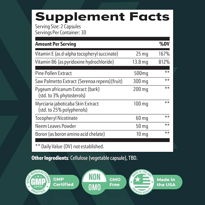 • It is manufactured in a GMP-certified facility in the USA using only all-natural, Non-GMO ingredients from the finest domestic and foreign sources — developed with a precisely crafted 2-step prostate-shrinking formula backed by scientific research on prostatic cholesterol elimination, chronic inflammation reduction, and testosterone balance restoration